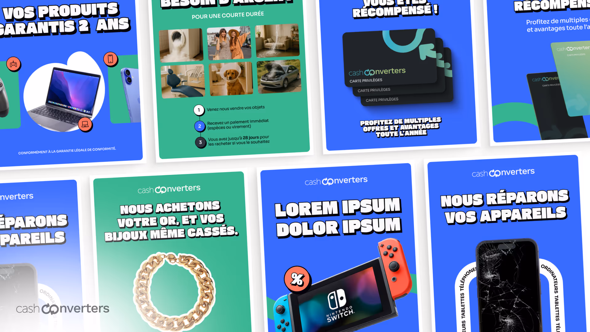 Notre première mission a été de nous approprier parfaitement la direction artistique de la marque. Logos, couleurs, typographies, styles photo, langage visuel : tout a été documenté et intégré à nos process pour garantir une fidélité parfaite. Cela nous permet de décliner chaque visuel dans le bon ton, sans jamais dénaturer l’univers graphique de Cash Converters.