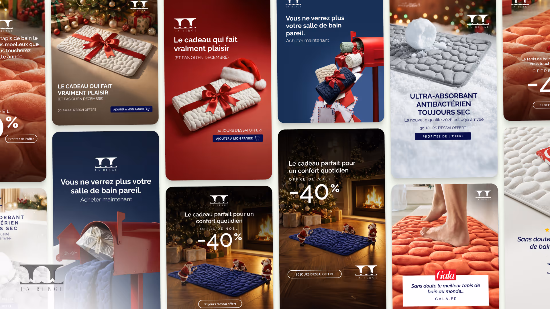 Notre périmètre couvrait à la fois des creative ads pour les promotions de fin d'année et début d'année, et une large production de visuels IA pour leur site Shopify, Pinterest et leurs canaux digitaux. La Berge avait investi dans des shootings produits à plusieurs dizaines de milliers d'euros - mais avait besoin de bien plus de visuels que ce que ces shootings permettaient de couvrir.