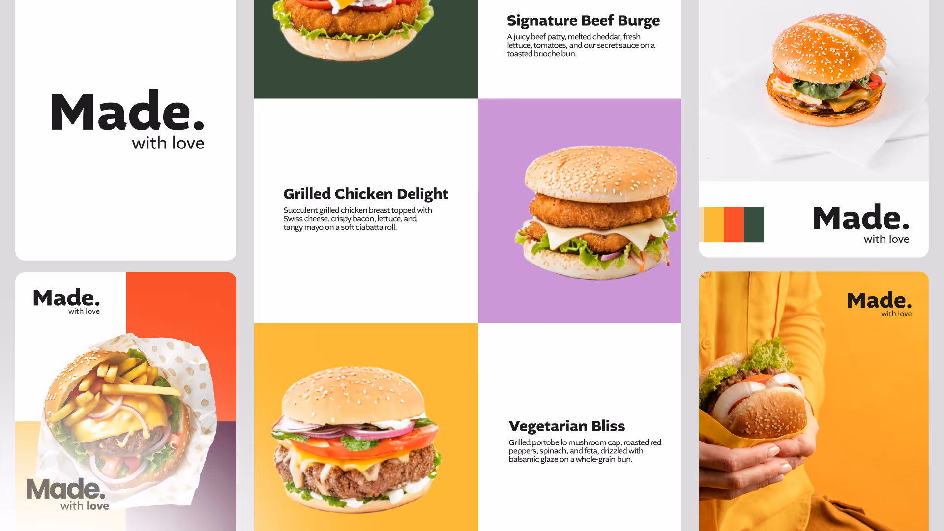 Montage de plusieurs hamburgers avec ingrédients frais, personnes les tenant et mangeant, mettant en avant la marque Made with love et le slogan Beyond Smash Burger We Create Experiences.