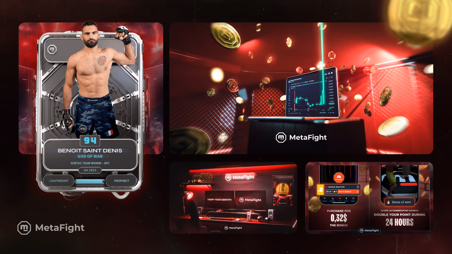 La nouvelle plateforme de marque Metafight Experience a été lancée avec une direction artistique claire, moderne et impactante. Les campagnes social media ont renforcé leur présence quotidienne sur Twitter/X, avec une identité visuelle unique, capable de captiver leur communauté Web3 et MMA.