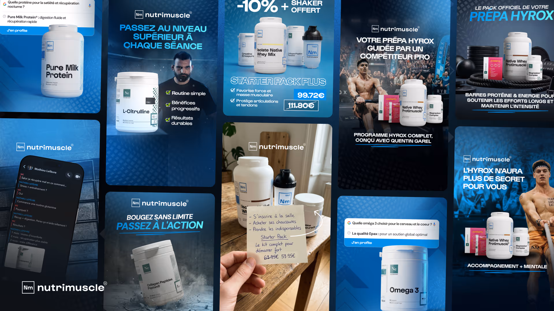 Notre rôle chez Nutrimuscle est de produire des batches de creative ads en continu - entre 8 et 12 créatives par batch, avec deux variantes par concept. Deux univers distincts coexistent dans notre production : les visuels orientés performance sportive - terrains, intensité, clubs - et les visuels lifestyle, plus accessibles, pour toucher un public plus large.