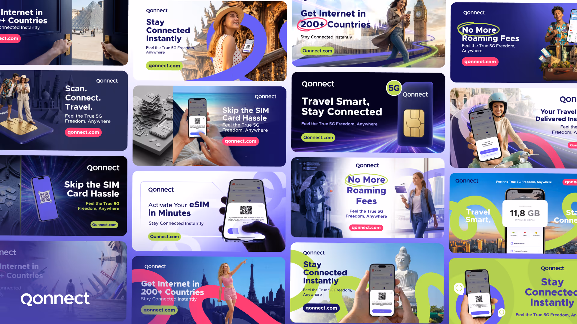 La particularité de cette collaboration : l'échelle géographique. Qonnect opère dans des dizaines de pays - et leur communication doit refléter cette présence mondiale. Nous avons produit des creative ads spécifiques pour chaque marché cible : un concept adapté, des codes visuels qui résonnent localement, une communication qui parle au voyageur là où il est.