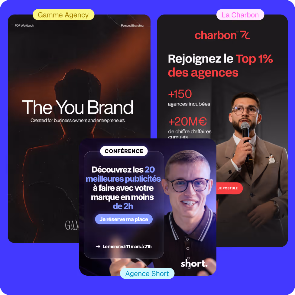 Identités visuelles complètes, créas publicitaires (Meta, Google, TikTok), web design, landing pages, motion design, supports print, pitch decks, packaging, social media — nous couvrons l'intégralité de la chaîne créative pour vos clients.