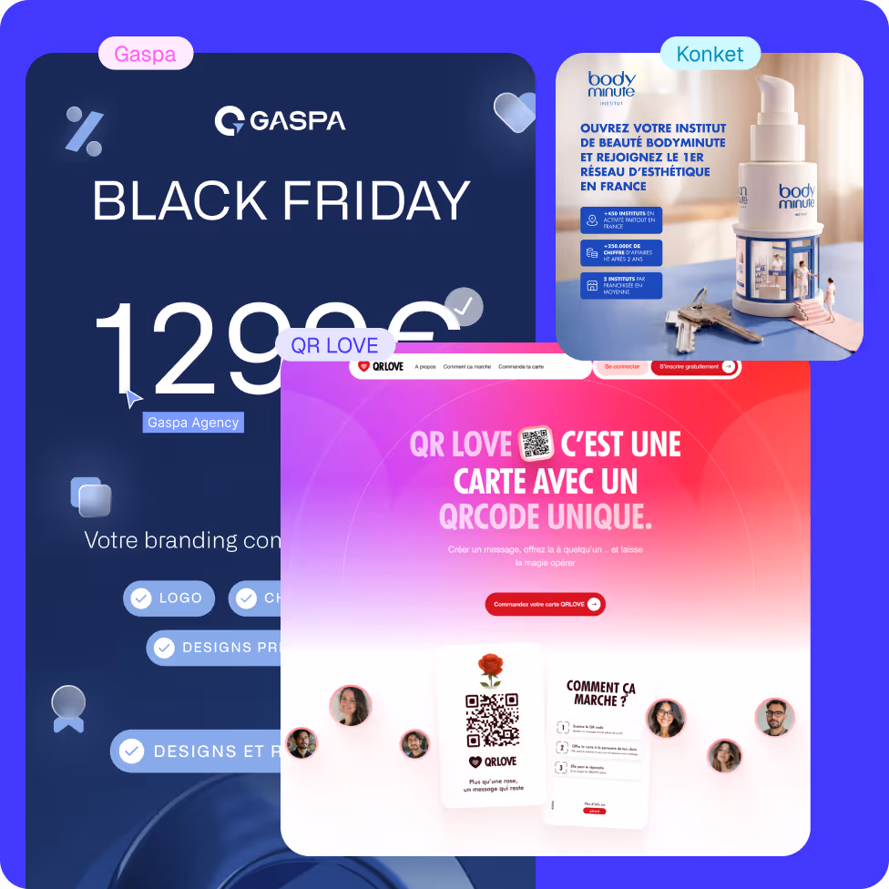 Identité visuelle, créas publicitaires, web design, motion, print : couvrez l'intégralité des besoins de vos clients.