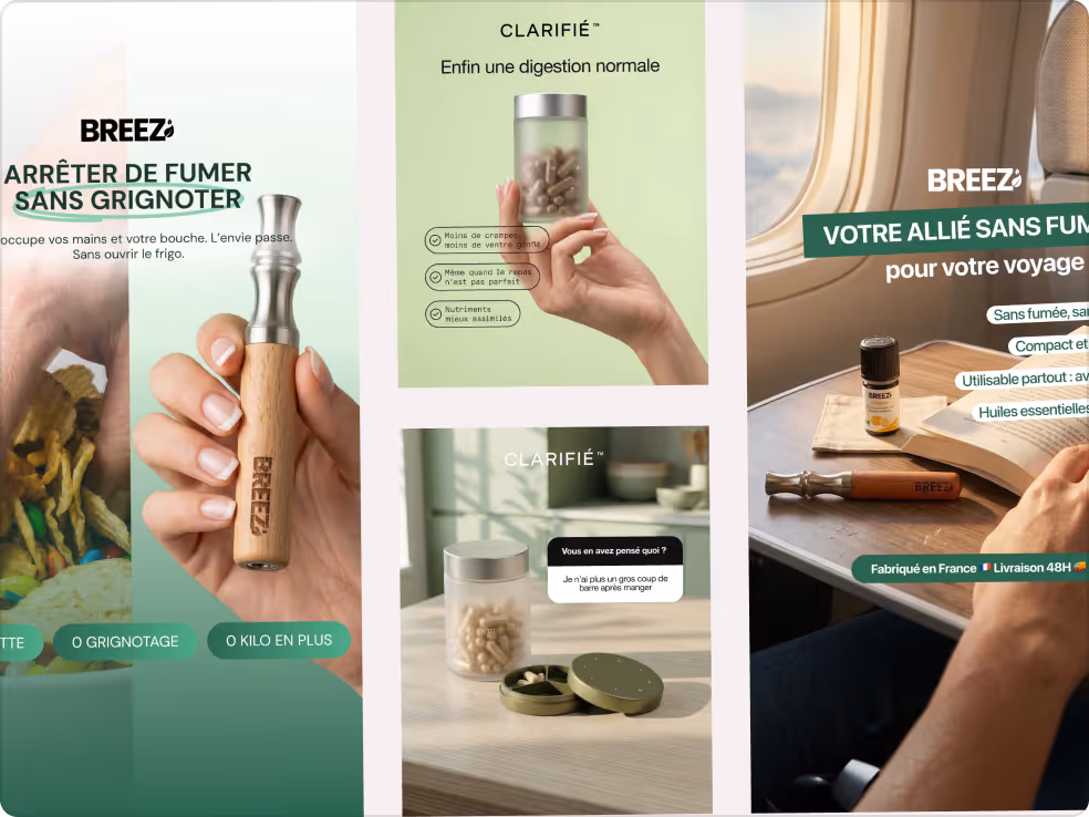 « Visuels produit lifestyle, pages Shopify, emailings, inserts colis, créas ads. Je suis le gardien de la cohérence de marque à chaque point de contact. C'est illimité, donc la marque itère sur son identité sans compter. Un univers visuel premium sans l'overhead d'une équipe interne. »